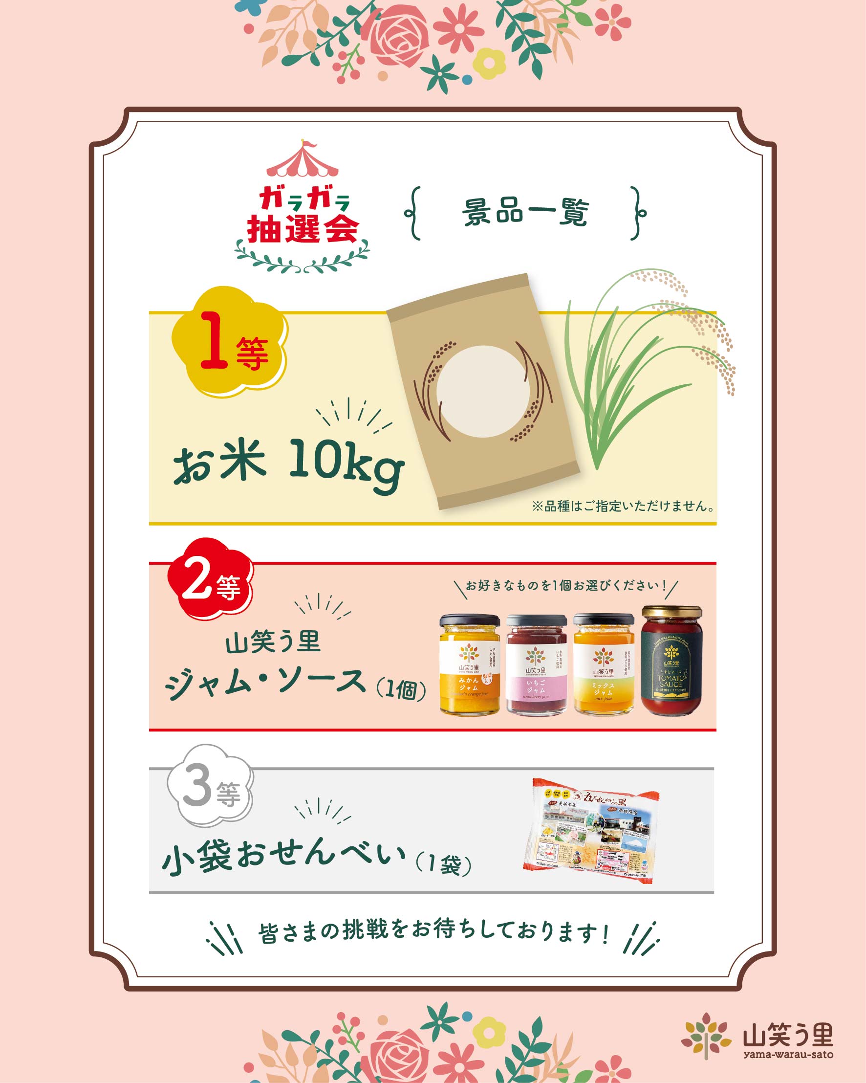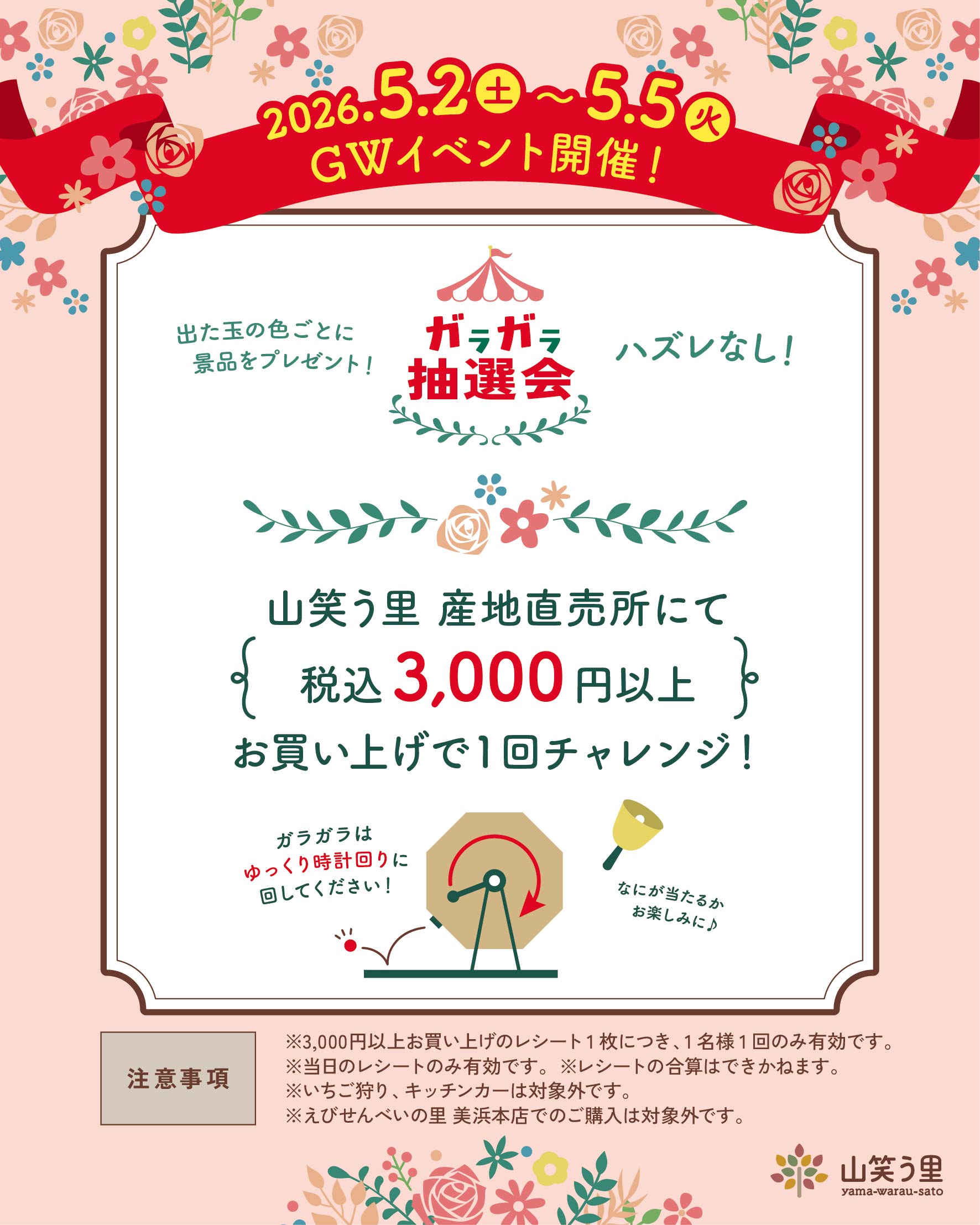 2026/5/2(土)~5/5(火・祝)ガラガラ抽選会開催! 2026年4月25日 kawai いつも山笑う里をご利用いただきまして誠にありがとうございます。 この度、2026年5月2日(土)~5月5日(火・祝)の4日間GWイベントとして「ガラガラ抽選会」を開催いたします! 「山笑う里 美浜直売所」にて税込3,000円以上お買い上げで1回チャレンジ!1等のお米をはじめ、山笑う里加工品など景品をご用意しております♪ ぜひご参加くださいませ! 「山笑う里 美浜直売所」についてはこちら コメントを残す コメントをキャンセルメールアドレスが公開されることはありません。 ※ が付いている欄は必須項目ですコメント ※ 名前 ※ メール ※ サイト 次回のコメントで使用するためブラウザーに自分の名前、メールアドレス、サイトを保存する。 上に表示された文字を入力してください。 Δ